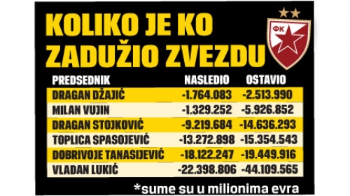 Zvezda najviše duguje bankama, nešto više od 17 miliona evra. Za pozajmice dug iznosi oko 7,5 miliona evra, bivšim igračima se duguje 1,7 miliona, a sadašnjim 1,6 miliona evra.