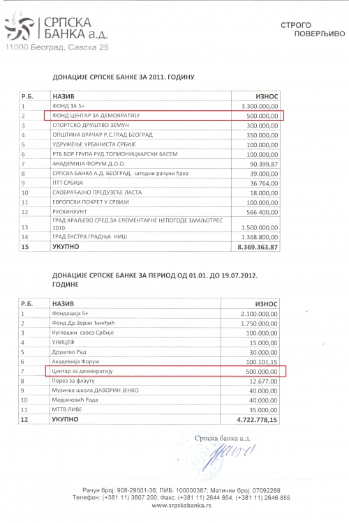 Međutim, na sajtu fonda je nemoguće videti koji projekat, od šest koliko je realizovano tokom protekle dve godine je finansiran novcem Srpske banke. Ta organizacija je samo objavila spisak stranih donatora na kome se ne nalazi Srpska banka, a u kojoj je inače Republika Srbija poseduje 99 odsto akcija. U momentu odobravanja spornih donacija ova banka je bila pod indikretnom kontrolom Vlade Srbije, koju je predvodila upravo Mićunovićeva stranka.