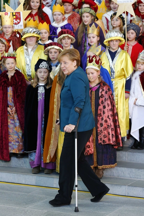 Krećući se uz pomoć štaka, Angela Merkel primila stotinak učenika koji tradicionalno za vreme praznika prikupljaju pomoć za izbeglice. Merkelova je povredila karlicu na skijanju u Švajcarskoj.